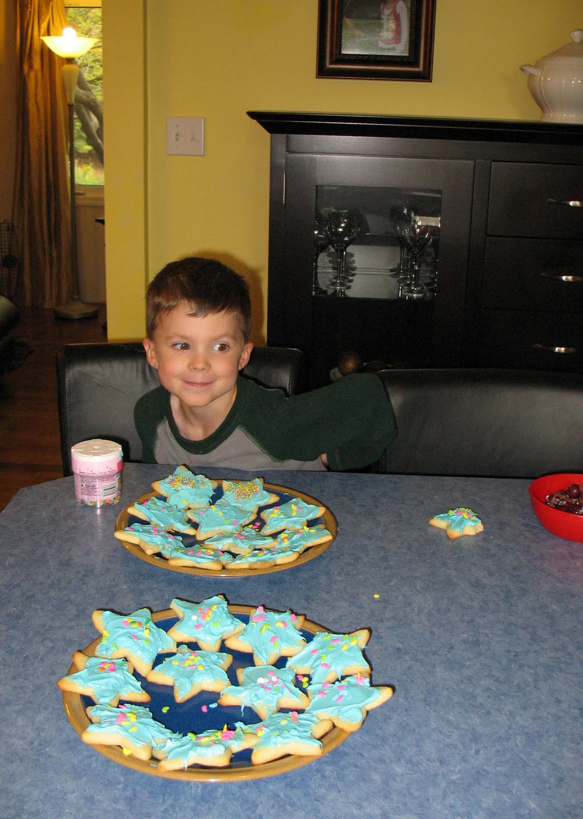 You’re lucky to be able to take cookies to his class! We have two birthdays this week, and it’s a new countywide policy to ban all food from schools (with the exception of lunch). We even have to pay $175 for the kindergarten snack.