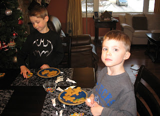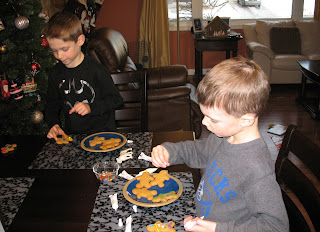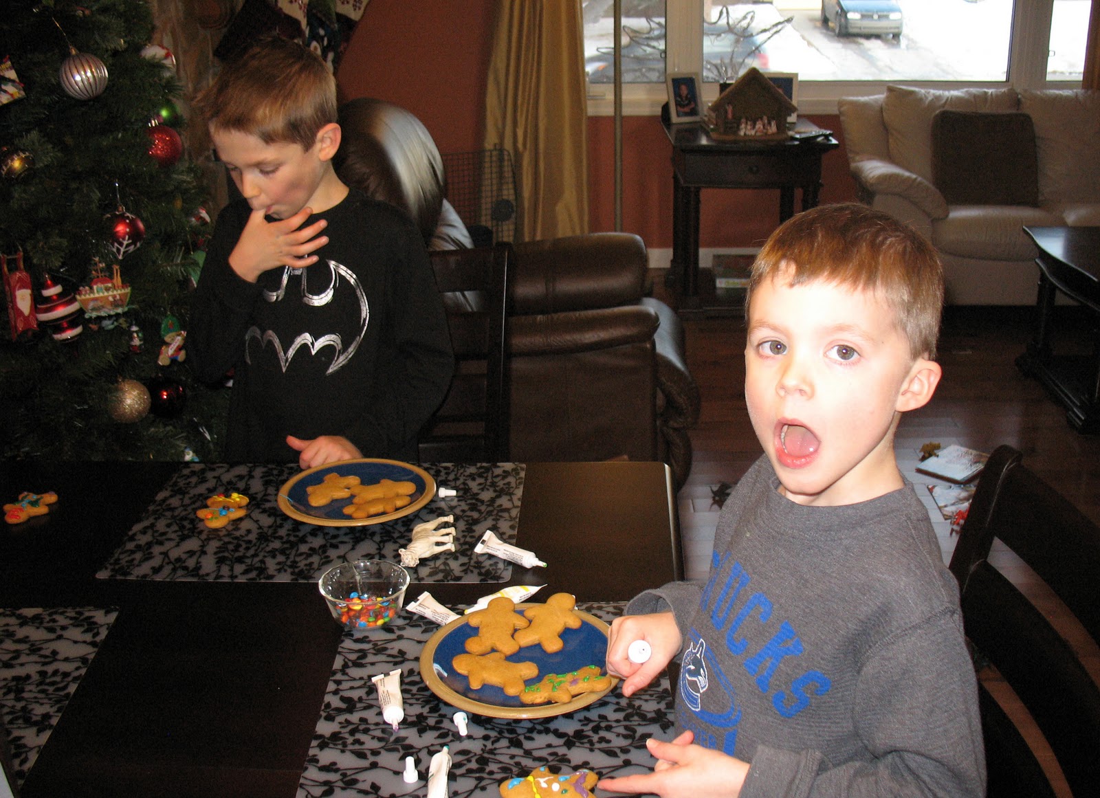 By the end of the appointment, I had a choice: I could just keep Mark home for the remainder of the afternoon, or I could rush him back to school in time for him to have recess and sing carols, only to rush back to the school to pick him up.  Lazy mom that I am, I just went home.  I was in need of some holiday spirit.  So I decided to make gingerbread people with the kids and listen to Christmas carols.