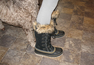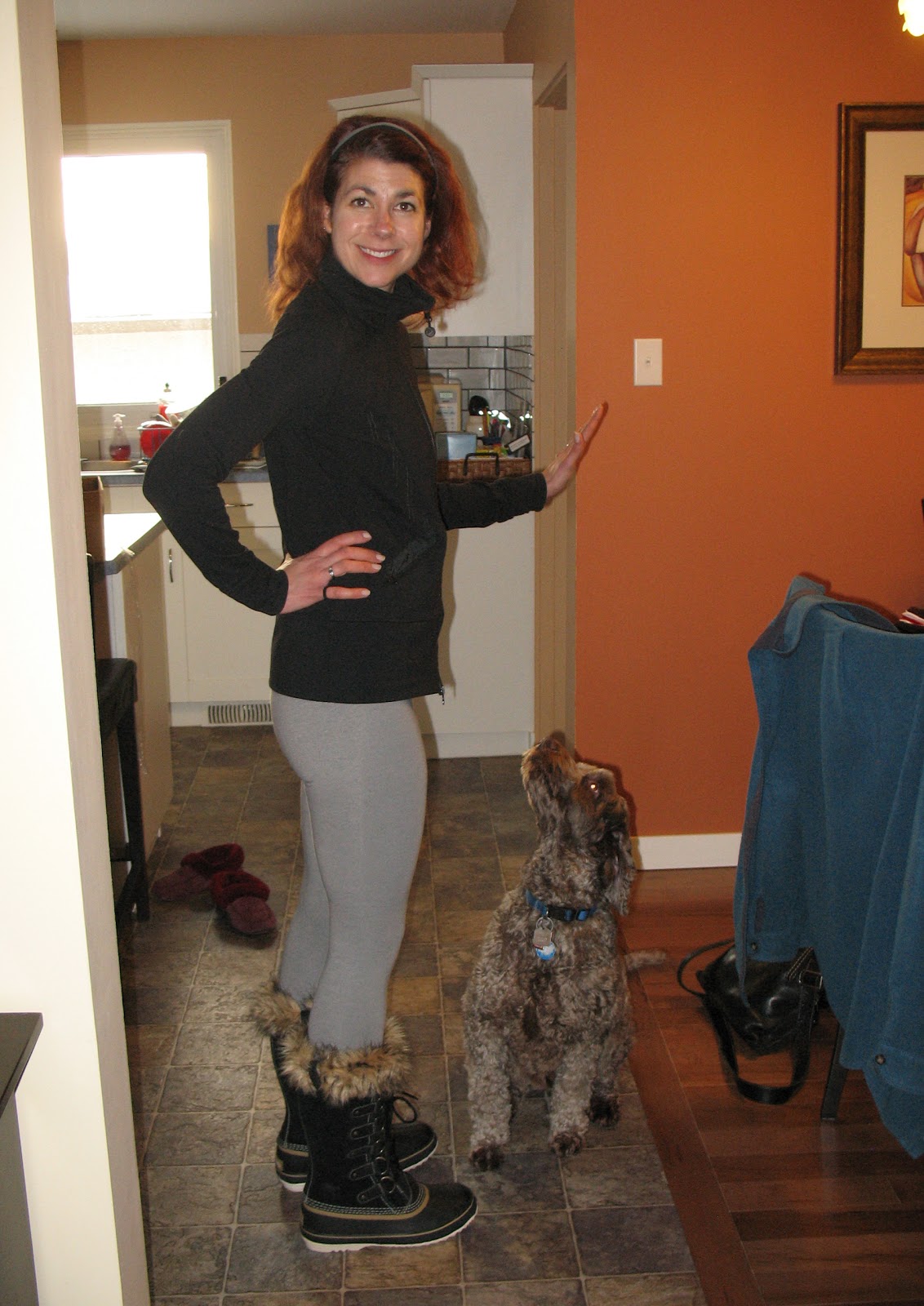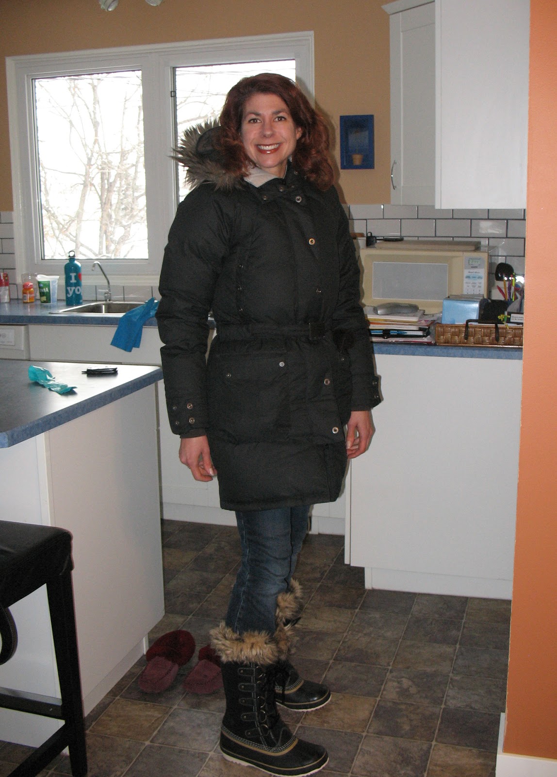 Now you will be warmer and get rid of extra calories due to lugging your boots around. I hope you also wear snowpants when you go out in that weather.