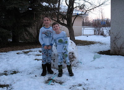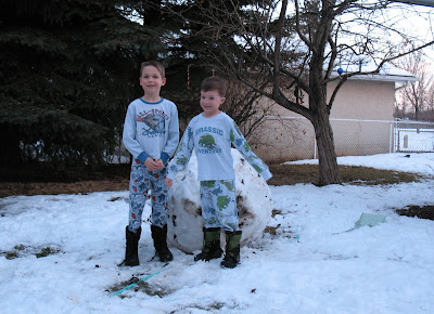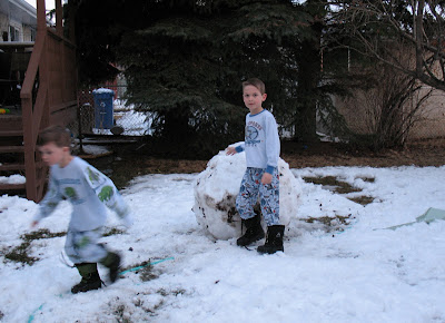 Here’s a view of our backyard; the kids are in their pajamas because someone who is not me took the kids out in only their pajamas to take a picture of the giant snowball that they made.