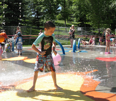 Yesterday we went to an old favourite, a little wading pool that has been recently turned into a splash pad.  If you’re in the area, you should check it out with the following caveat: the recent refurbishment means that grass sod has been newly laid and so, in the spirit of following the signage to keep off the grass, there is very little space to lay out picnic blankets, although I’m sure that will sort itself out as the summer goes on.