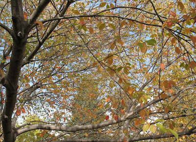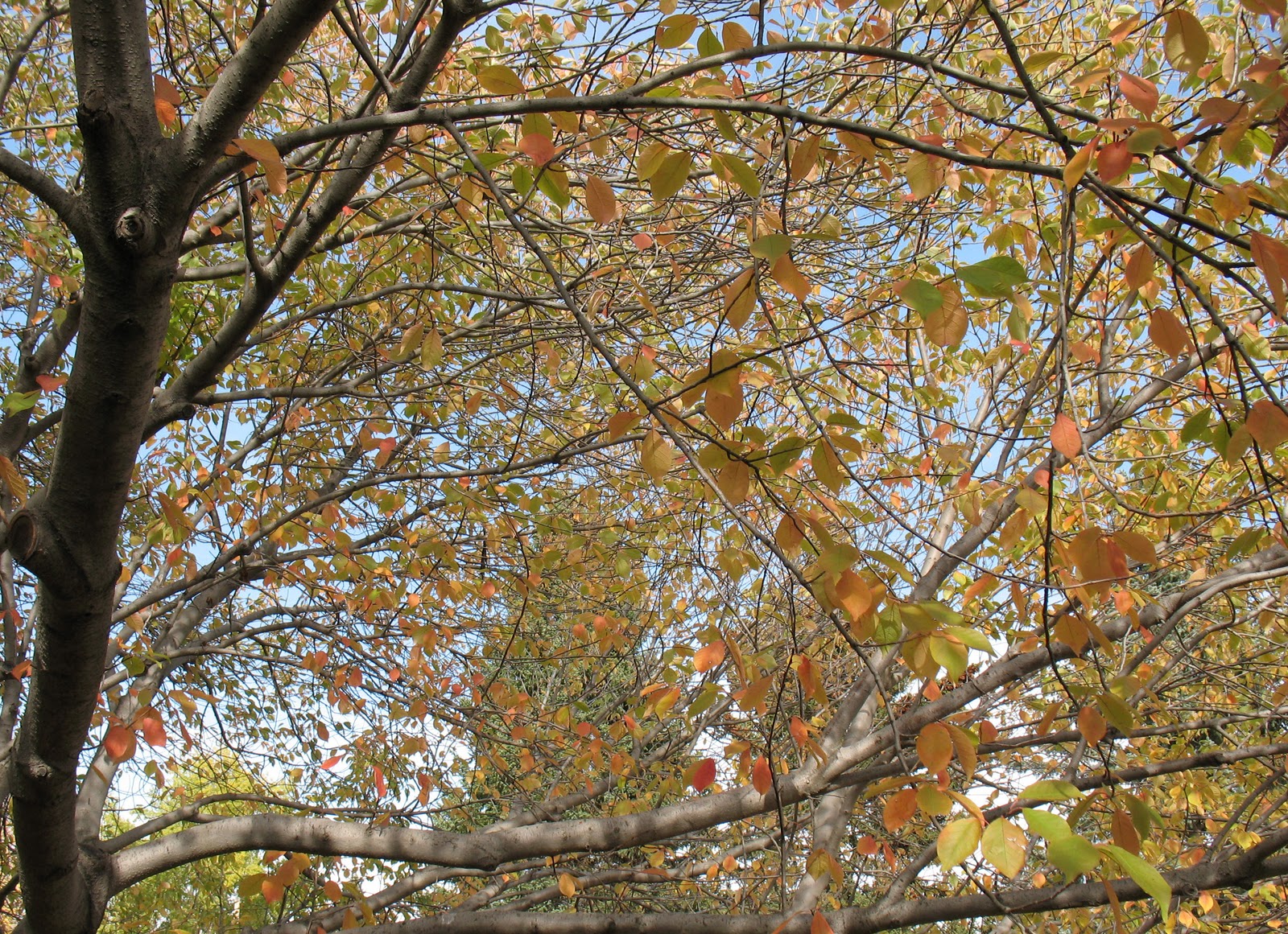 Usually the leaves on the Mayday tree turn brown from frost and then fall off rapidly, but this year has been so mild that they are actually changing colour.