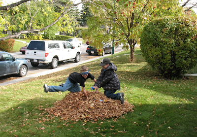 I woke up so exhausted this morning that I actually went back to bed rather than heading for the yoga studio; that’s something that almost never happens and so I’ve been feeling off kilter all day. I can’t figure out my exhaustion; I’ve certainly had a lot of sleep in the past couple of days. Either I’m fighting some sort of virus or I’m just completely burnt out from attempting to keep a pleasant demeanor in the face of passive aggressive criticisms. I tried to regain my normal energy by taking on a number of tasks today – sorting and labelling photos, baking banana bread, cleaning the house, making salsa and kale chips. While I had the kale happily dehydrating in the oven, I decided to rally the boys and rake the leaves. With raking comes jumping in the leaves: