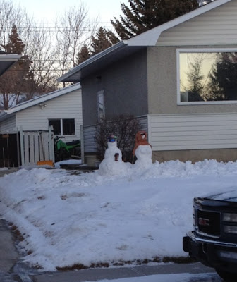 Also somewhat cheering is the sight out my front window. My single male neighbour seems to be exercising his artistic side by making snow sculptures: