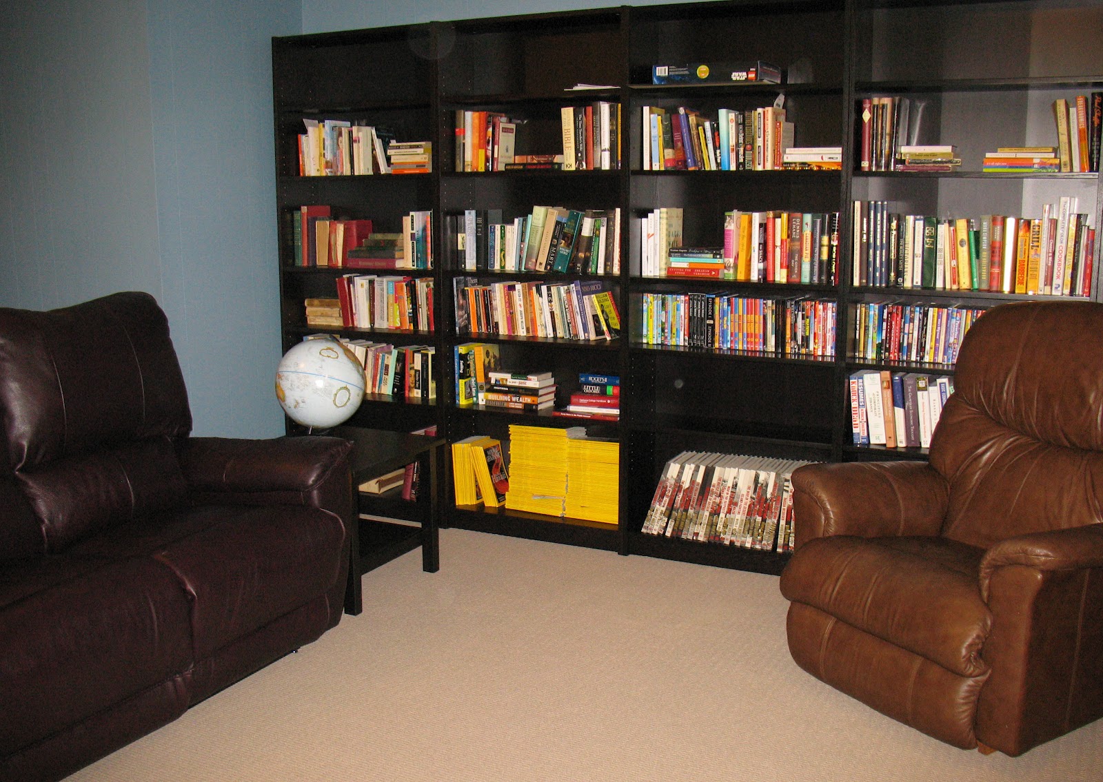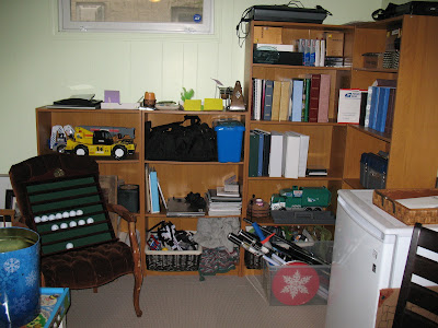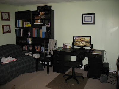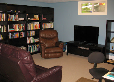 And the office (i.e., computer and desk) has been moved into this living space so that when the kids are playing Wii and desperately want me to see them slay Stormtroopers/ win a Mario Kart race/ whatever, I can just look over.