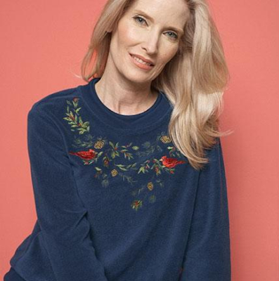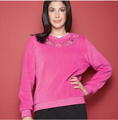 The first sweater is advertised as a “face-framing” sweater for ultimate face-framing flattery. The other two are called “fooler” sweaters, and I would like to know why. Wait. I just answered my own question – it is due to the “double cross-over collar” which “fools” people into thinking that you are wearing two “shirts”. I got a little crazy with the quotation marks there, but can you blame me? That poor blonde woman is staring at me with angst, probably because she is modelling a sweater with cardinals on it.
