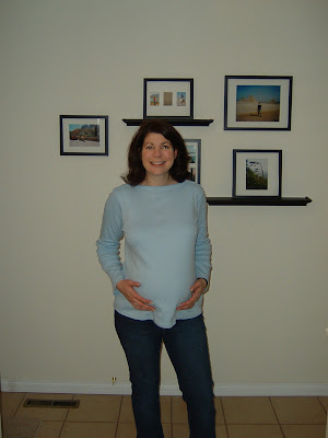 Today I feel almost totally normal. I even donned jeans today, albeit my oldest, softest, most broken in pair of boot cuts. A huge step up from “dance pants”. On days like today, I kind of wished I had Pajama Jeans, though. Have you seen the advertisements for Pajama Jeans? About a month ago, my husband was out of town and I was on the couch, alone with my wine. I saw this commercial for Pajama Jeans and I became somewhat fascinated with the concept. Jeans…that feel like pajamas! Actually, I think they already have those: they are called maternity jeans. I had a pair of maternity jeans that saw me through massive weight fluctuations, and that I continued to wear for a few months post partum. They were below-the-belly style, with a giant elastic waistband, and I loved them dearly. Here I am wearing them, and let’s just keep in mind that this is a full three months before I was actually due with Mark: