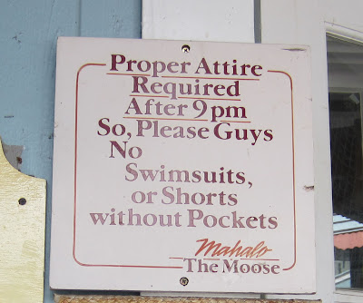 The shorts without pockets thing- any bottoms anyone is going to swim or dive in will not have pockets (swim trunks, board shorts, skin suits, etc). People were annoyed they couldn’t roll off the beach and into a restaurant or shop, so when “No Swimsuit” signs started going up, they started getting very specific- “This is a DIVE SUIT, not a SWIM SUIT/These are BOARD SHORTS…” Legitimate street clothes for men will have pockets, and the sign covers their bases (at least for now).