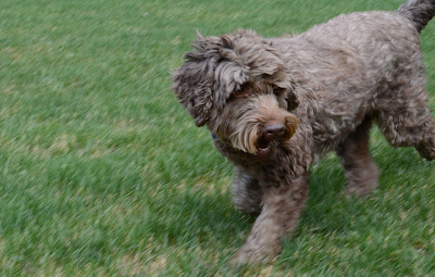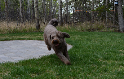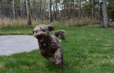 Did you have a nice long weekend? Despite our original plans falling through, we managed to have a lovely one. We spent a night at my parents’ cabin – the “cabin” that is three times the size of my house and has twice as many bathrooms, which is my idea of camping – and played in the garden a lot. My husband has been trying to get action shots of Barkley to make me a “Barkley calendar”, but so far the shots have been a bit blurry:
