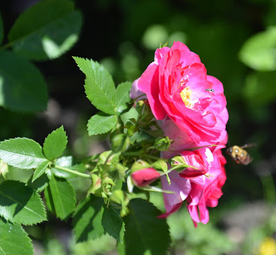 The rose bush that I planted a few years ago is now covered in blooms, and is very popular with my neighbour’s bees: