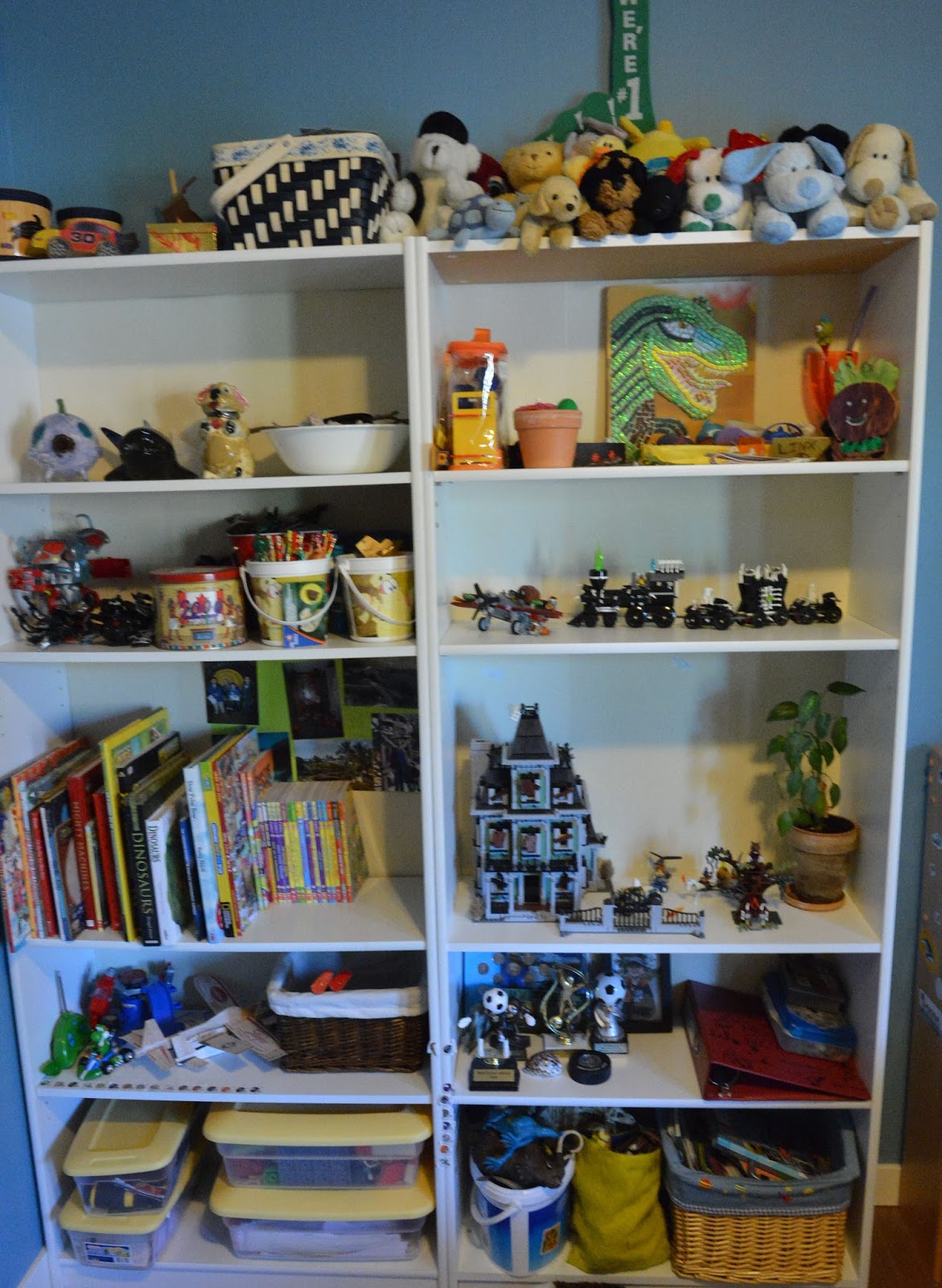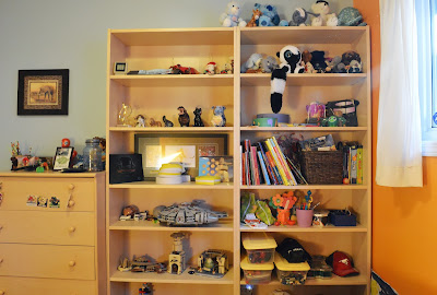 In the interest of sibling fairness, here is a photo of Jake’s fairly neat shelves. Note that his room is painted orange and blue. Home decor note: orange is a bitch to paint.