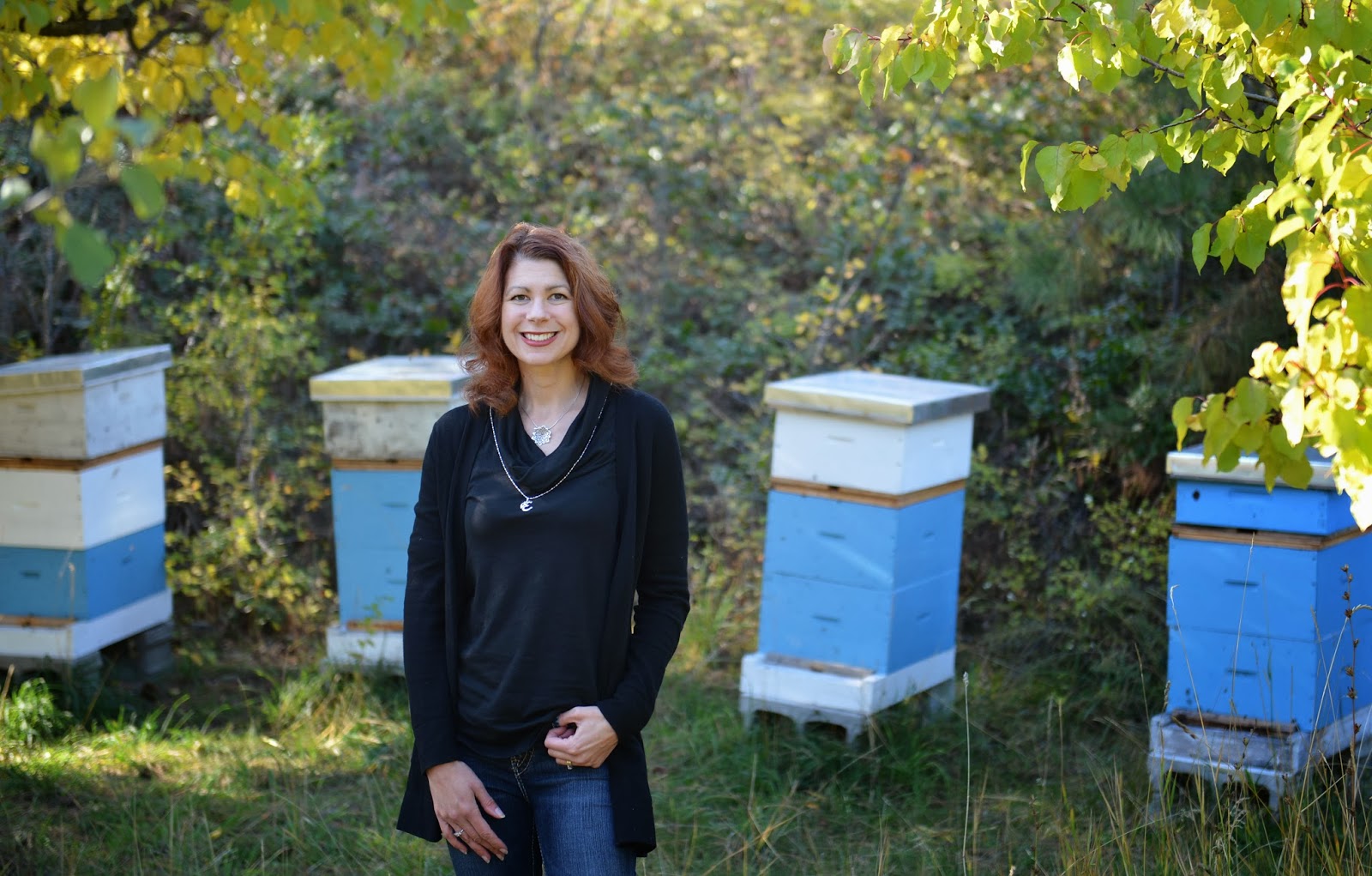 Love the sweater with the bee hive backdrop!