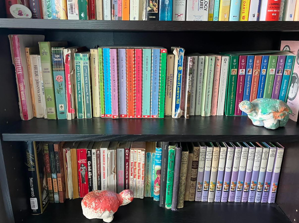 My main book collection is in my bedroom, where it belongs! One of my all time favorite books is Rebuilding Coventry by Sue Townsend, and there is a passage where the main character describes her books as her “harem” and talks about keeping her favorites by her bed. I have a smaller collection, but a lot of these books date back to middle school, and some even before that. While it’s true that I am unlikely to reread Ayn Rand or (HI ENGIE) Theodore Dreiser ever again, I can’t see a point in my life where I would ever want to get rid of my books.