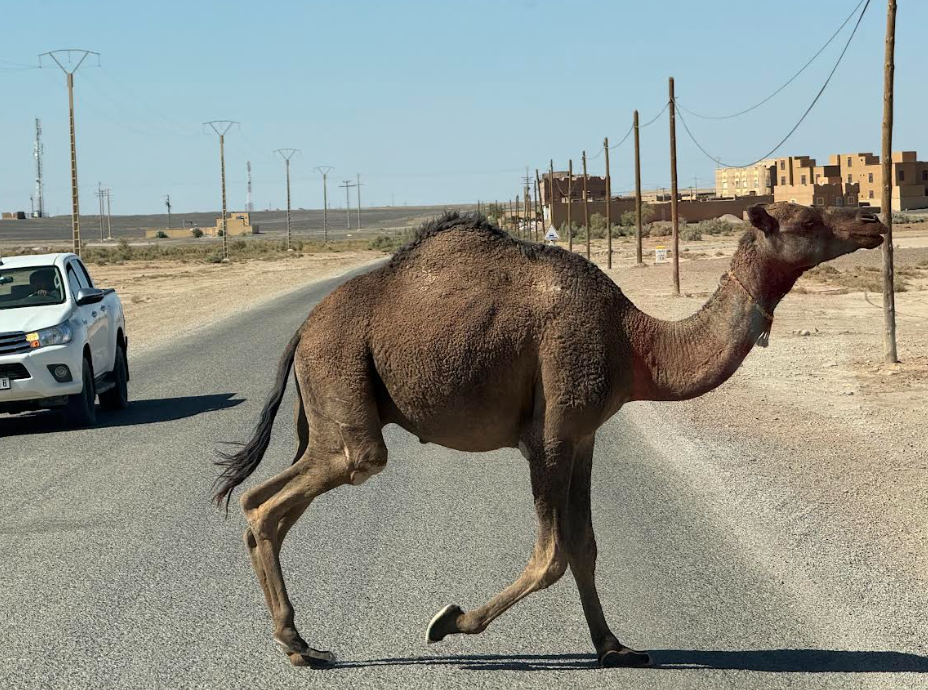 Camels are ubiquitous in Morocco, and not just for carrying the likes of me around; they are an important part of the economy, and sometimes they like to block off traffic.