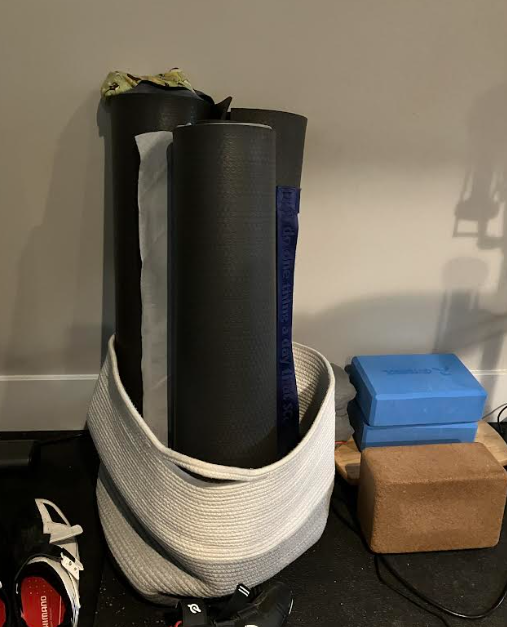 One of the mats was purchased to leave at this house, when we lived in Calgary, so that I didn’t have to schlep it back and forth. Another was my practice mat, which I kept in a storage space at the Yoga Shala, and the other was my teaching mat, which lived in my minivan and would be taken to all the non-Shala places I used to teach. And then the pandemic happened, and the Shala closed, and my classes went from ten a week to two, and those two were taught via zoom; my need for multiple mats evaporated, but my mats live on.