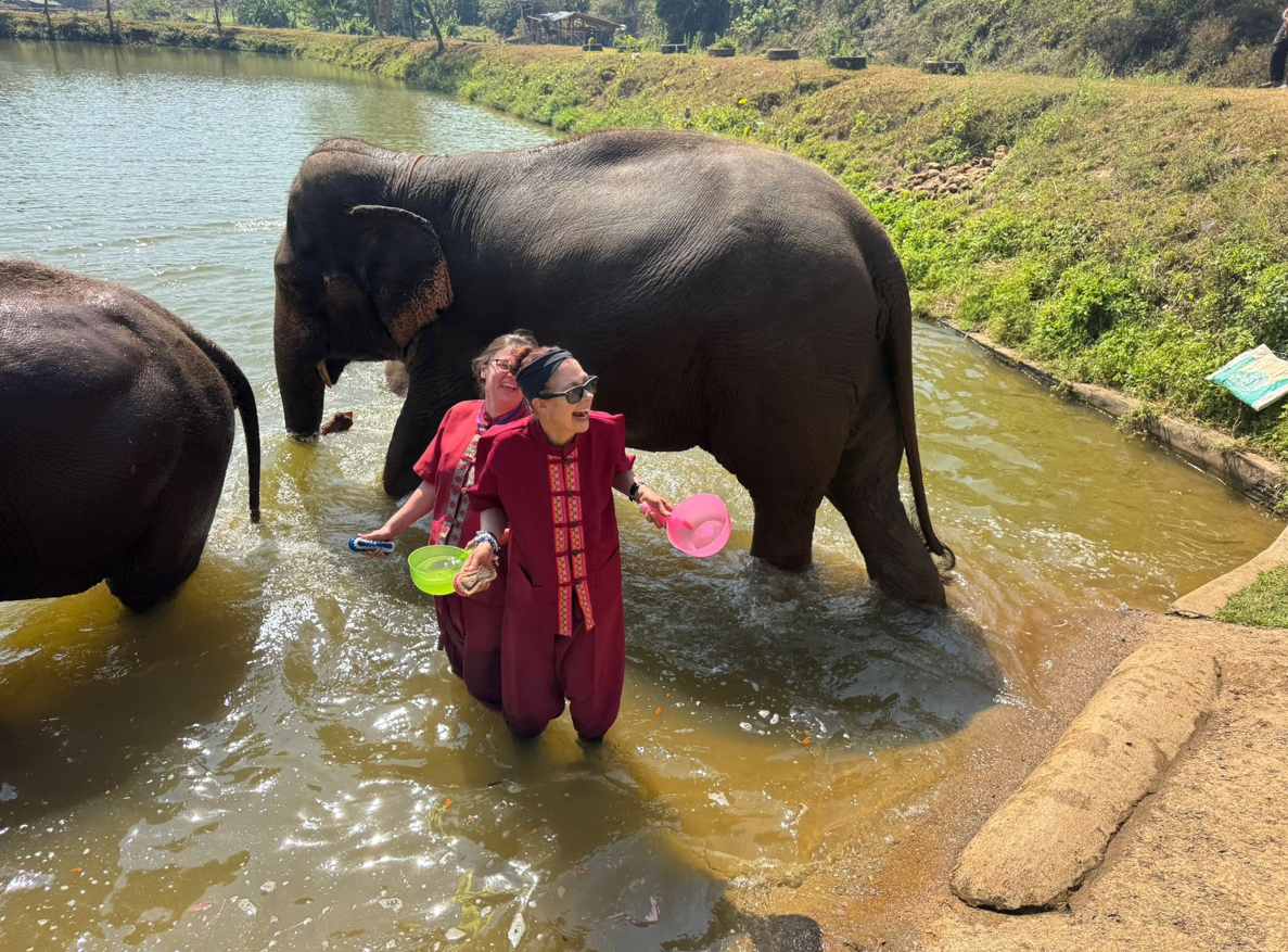 Such intelligent, beautiful animals. I love them, and it was such an incredible gift to be able to be so close to them and to see their personalities. The young male was particularly funny; he kept shoving greenery and bunches of bananas underneath his tusks, stealthily removing them to eat later. While we were in the pond bathing them, the male’s caretaker said something to him, at which point the elephant lowered his trunk into the water, raised it slowly, and sprayed us. I got sprayed! By an elephant! I did not even know that was on my list of things I wanted to happen in my life, but it was.